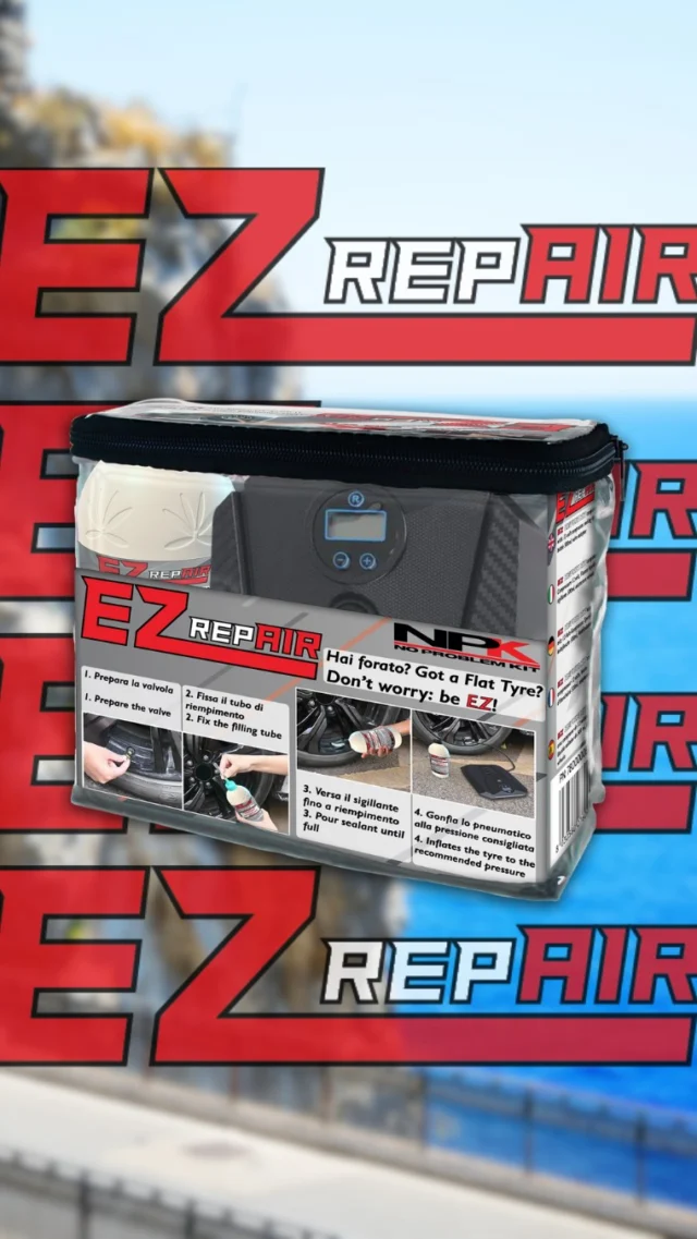 Compatto e leggero che al suo interno comprende compressore 12 volt, Flacone liquido sigillante 500ml, adattatore valvola