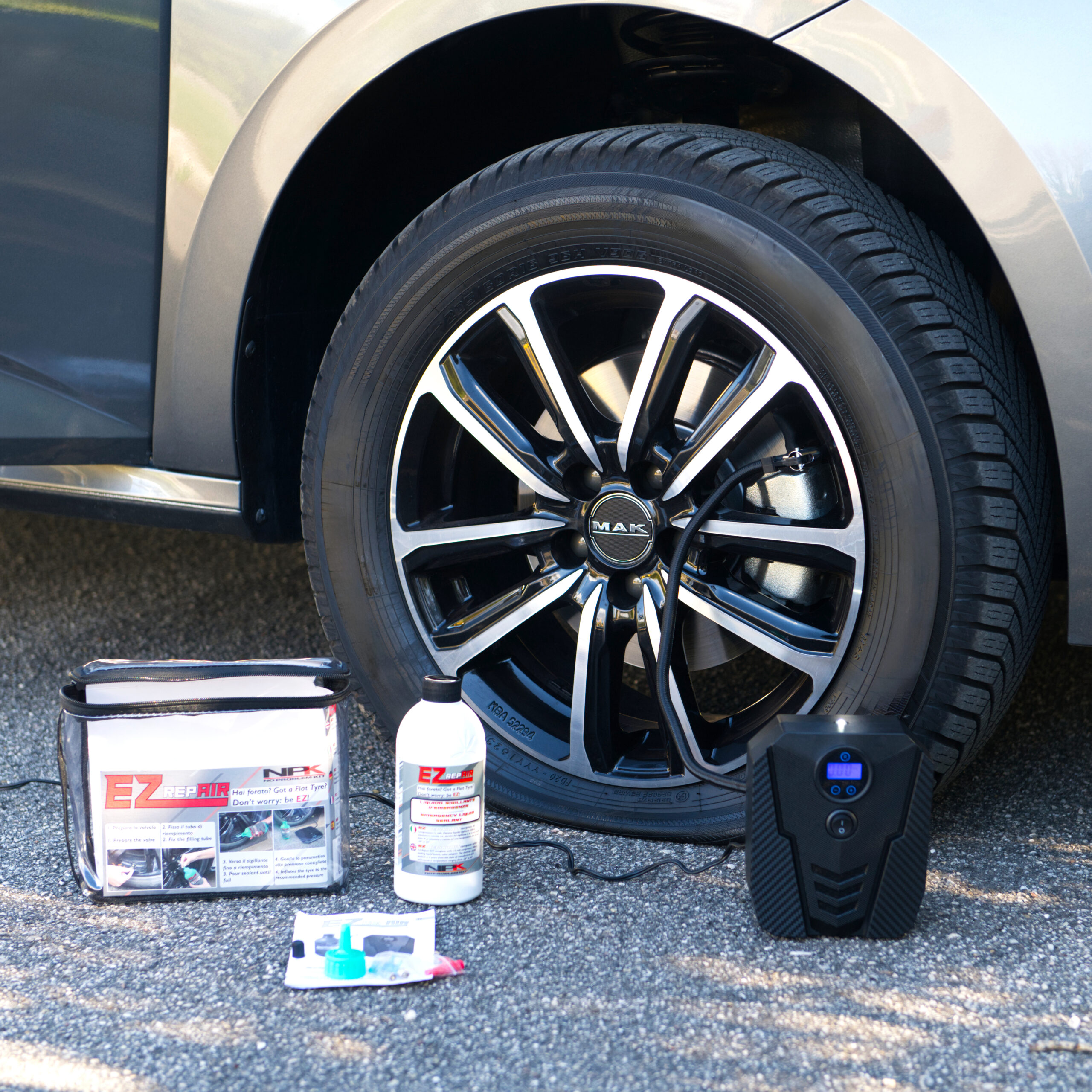 NPK EZ Repair: il Kit Gonfia & Ripara targato No Problem Kit compatto e leggero che al suo interno comprende compressore 12 volt, Flacone liquido sigillante 500ml, adattatore valvola. La durata del sigillante è di 3 anni dalla data di produzione e resiste ad una temperatura che va dai -20° ai 40°.
